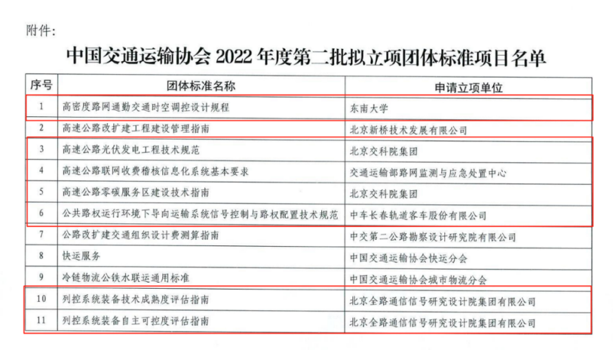 6月14日-17日,中國交通運輸協會(以下簡稱協會)通過線上視頻會議形式,組織召開“2022年度第二批團體標準立項審查會”。審查會上,與會委員、專家審閱了團體標準申報的相關材料,聽取了申報單位對團體標準立項情況的相關匯報,對申報立項的團體標準的必要性、可行性和前期準備工作進行了質詢討論,提出了全面客觀的審查意見,為團標項目的定位、應用指明了方向,形成了審查會議紀要。根據《中國交通運輸協會團體標準管理辦法》相關規定,審查專家組一致同意37個項目的立項申請,其中,《高速公路零碳服務區建設技術指南》等27個項目由新技術促進分會發起(如下圖)。目前協會正在對擬批準立項項目進行公示。