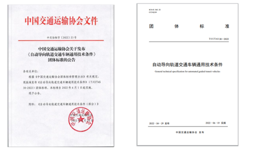 《自動導向軌道交通車輛通用技術條件》(T/CCTAS30-2022),由中國交通運輸協會新技術促進分會提出,聯合中車南京浦鎮車輛有限公司、上海地鐵維護保障有限公司、上海軌道交通八號線三期發展有限公司、上海市隧道工程軌道交通設計研究院、上海申凱公共交通運營管理有限公司、蕪湖市標準化研究院、深圳市機場(集團)有限公司、成都天府國際機場建設指揮部、北京首都國際機場股份有限公司、北京博維航空設施管理有限公司、北京新機場建設指揮部、廣州白云國際機場股份有限公司、深圳市市政設計研究院有限公司、華設設計集團股份有限公司共同起草編制,于2022年6月1日起實施。