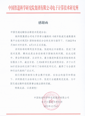 團體標準作為國標、行標等標準的有效補充,能夠快速響應市場和新技術發展,解決新產品、新技術、新服務在標準缺失或滯后上的問題。中國交通運輸協會新技術促進分會積極創新、主動作為,著力推進和落實團標采信服務工作,努力擴大團體標準實施應用范圍,獲得了主編及參編單位的充分認可,并向分會紛紛發函致謝。