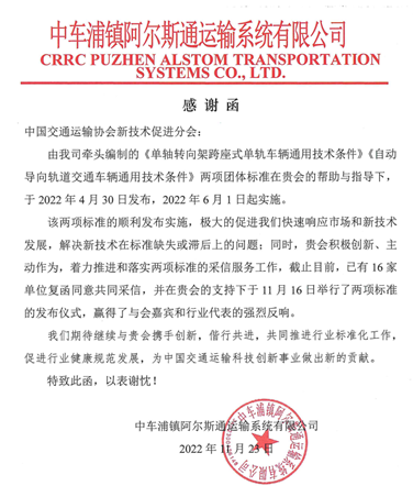 中車阿爾斯通運輸系統有限公司感謝函