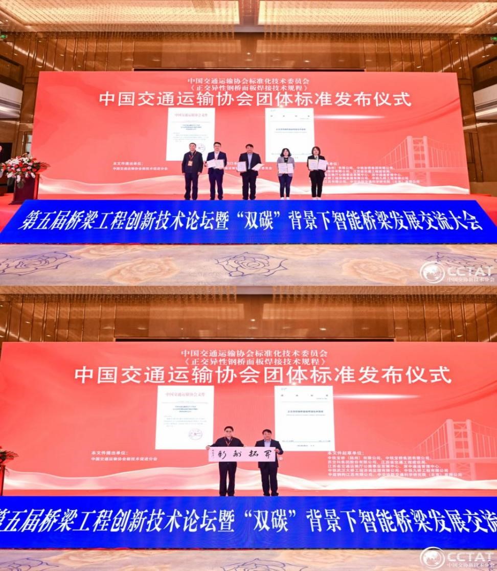 中交第二航務工程局副總經理、總工程師張永濤,中國交通運輸協會副會長鐘華分別致辭,中國交通運輸協會副會長兼秘書長、協會標準化技術委員會主任委員李剛做《正交異性鋼橋面板焊接技術規程》標準發布儀式致辭,并向起草單位代表中鐵寶橋(揚州)有限公司、蘇交科集團股份有限公司、中鐵九橋工程有限公司、中建鋼構江蘇有限公司頒發標準公告和文本。民革中央原副主席修福金為標準起草牽頭單位中鐵寶橋(揚州)有限公司頒贈他的作品和寄語。