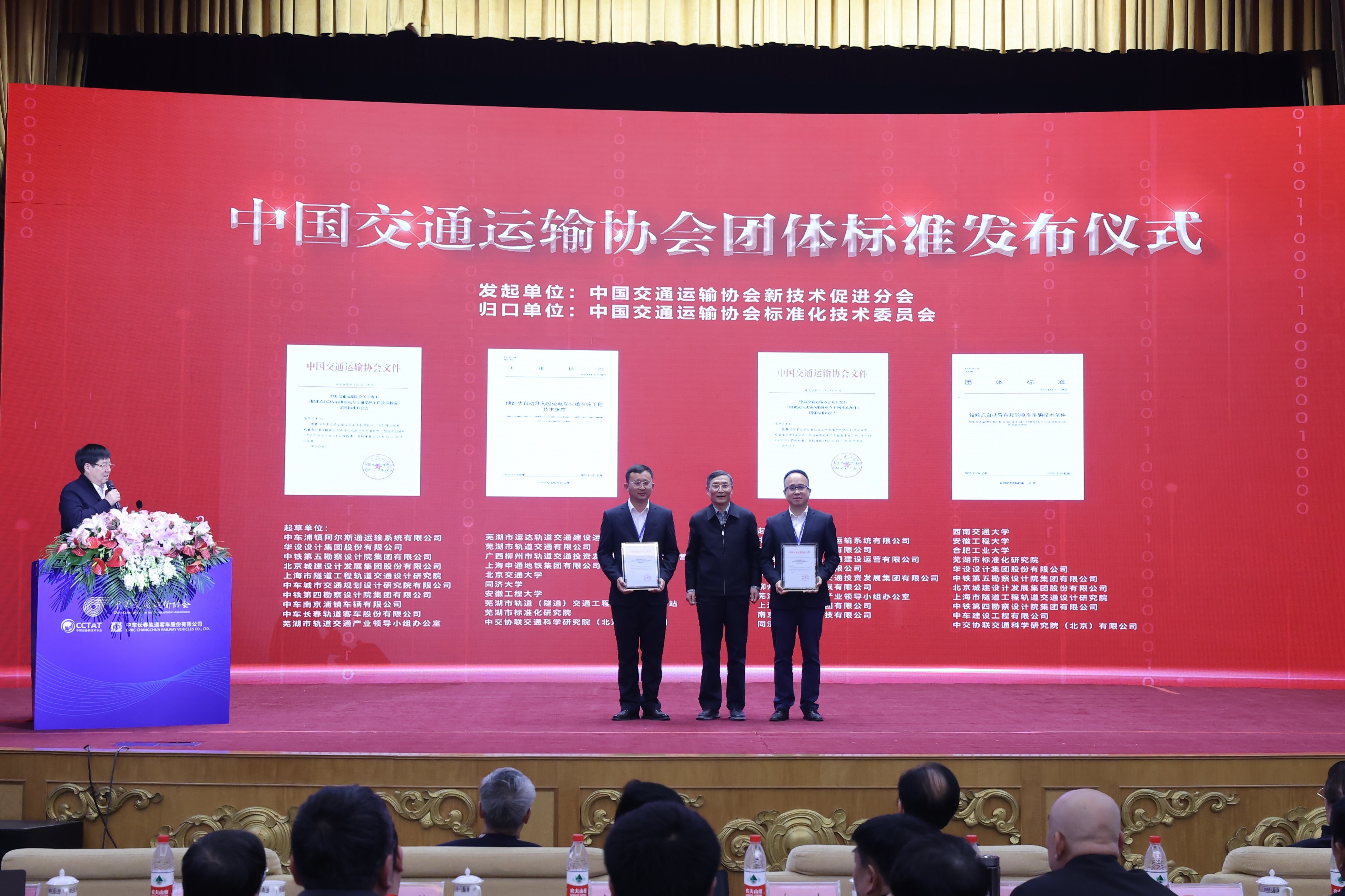 在協會團體標準發布儀式上,中國交通運輸協會副會長兼秘書長、交通運輸部政策研究室原主任、協會標準化技術委員會主任委員李剛發表致辭,并向由新技術促進分會發起的《儲能式自動導向膠輪電車車輛技術條件》《儲能式自動導向膠輪電車交通系統工程技術指南》標準起草單位代表中車浦鎮阿爾斯通運輸系統有限公司頒發標準發布公告和文本。